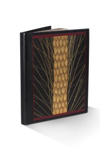 rouge, grand épi de blé formant colonne en feuille de métal doré martelé, des filets dorés en diagonales entourent cet épi (certains filets sont légèrement décollés), doublure de maroquin rouge, gardes de moire noire, chemise demi-maroquin, étui (F. L. S[chmied].).