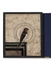 maroquin blanc, noir, bleu ou beige, quelques pièces bleues plus importantes, deux grands laques en doublure du volume de texte, gardes de faille bleue, non rognés, chemises demi-maroquin, emboîtage (F. L. Schmied - Laque J. Dunand).