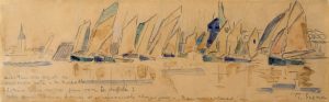 SIGNAC PAUL (1863-1935) — «Croix-de-Vie, le défilé des voiliers», lettre autographe signée avec dessin. — [1920], aquarelle et crayon sur papier. 10 cm x 32,5 cm (à vue) sous encadrement. — Signé en bas à droite «P. Signac», annotée...