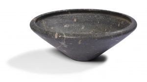 ÉGYPTE. — Coupe à fond plat et à panse tronconique surmontée d’une lèvre moulurée éversée. — Diorite noire mouchetée de rose. — Dépôt calcaire.