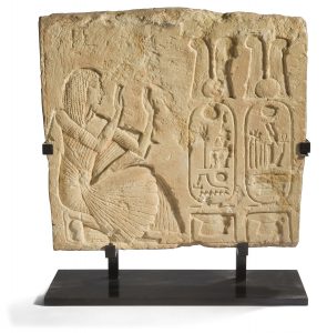 ÉGYPTE. — Bas-relief gravé en creux d’une scène. — Scène représentant un haut dignitaire en adoration devant les noms de Ramsès II contenus dans deux cartouches surmontés de hautes plumes.