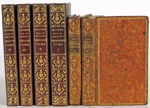 [4]-332, [4]-332 pp.; 4 frontisp. non signés (n.c., ex. non rogné en queue avec manque de papier dans le bas du titre du t. I, plusieus pp. lég. brunies, rouss. +/- pâles par endroits, plusieurs pp. non coupées). Rel. pastiche xviiie s., non signée : plein maroquin brun aubergine, plats cernés d'un triple filet doré, dos lisses à caissons fleuronnés dorés, filet et roul. ornée dorés sur les coupes et remplis. # Cohen 460; # pas dans Reynaud. Joint : GRESSET, Jean-Baptiste-Louis.- Oeuvres. Londres, [Cazin], 1780, 2 vol. in-12° (H. : 12 cm), [4]-320 et 312 pp., plein veau clair marbré de l'ép., plats cernés de trois filets dorés, dos lisses fleuronnés dorés avec étiq. de cuir vert, tr. dorées (us. aux mors, coupes et coins, rouss.). Frontispice par N. de Launay d'après Marillier figurant un passage de Ver- Vert. # Cohen 461 (autre éd., ill., à cette date); # Reynaud 221 (signale l'éd. sans gravures).