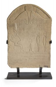 ÉGYPTE. — Stèle cintrée bilingue (rare) gravée d’une scène représentant le dieu Osiris.