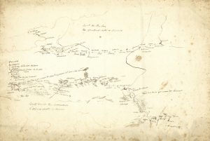Carte d’Asie mineure, dessinée à l’encre brune avec contours à la sanguine, retraçant la « Route de Busbek de Constantinople a Amasie », d’après les Lettres turcques du diplomate Ogier Ghiselin de Busbecq, et la « Route de M. Des Monceaux d’Alexandrette a Smyrne », avec légendes.