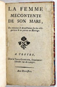 (Livre populaire) — [érasme].- La femme mécontente de son mari, ou Entretien de deux dames sur les obligations et les peines au mariage. Troyes, chez la veuve Garnier, [1738]. In-12° : 47 pp. (pet. et lég. rousseurs, mouill. marg. à la p. 43)....