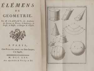 CLAIRAUT Alexis Claude (1713-1765). — Élémens de géométrie (Paris, Durand neveu, 1765). — In-8 (19,7 x 11,9 cm), veau jaspé brun, dos lisse orné, pièce rouge, tranches rouges (reliure de l’époque).