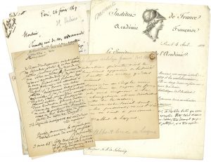 Honoré d’Albert de Luynes (pensée), François-Guillaume Andrieux, Jules Barthélemy-Saint-Hilaire (2), Pierre Bénézech, Charles-Ernest Beulé, Adolphe Billault, Jean-François Boissonade, Gabriel Bonvalot, Albert de Broglie, Armand-Pierre Caussin de Perceval, Henri Cernuschi, Aimé Champollion-Figeac, Charles-Simon Clermont-Ganneau, Gaspard Coriolis, Amédée de Cubières, Auguste Dornès (sur la culture du colza dans les marais de Fos), Camille Doucet (4, dont une en vers), Amaury Duval, Georg Ebers (2), Adolphe Franck (2), Joseph-Marie de Gérando, Louis Héricart de Thury, Abel Hovelacque, Achille Jubinal (6), Stanislas Julien (2), Julius Klaproth, Henry Gally Knight, Lorédan Larchey, Ernest Lavisse, Auguste Le Jolis, Charles-Aimé de Lesseps, Alexandre Leymerie, Jean Lorédan, Victor-Adolphe Malte-Brun, Alexis Mathon, Eugène de Monglave, Guillaume de Montbel (2), Mathieu de Montmorency-Laval (diplôme de l’Académie d’Horticulture), Jean-Baptiste de Montyon, Albert de Mun, Alfred Naquet (2), Joseph Naudet, Frédéric Passy, Henri Patin, Georges Perrot (10), comte de Pibrac, Edmond Picard, Gustave de Pontécoulant, Samuel Pozzi (2), Antoine Quatremère de Quincy, Raoul-Rochette (7), Charles Ravaisson-Mollien (8), Élisée Reclus, Ambroise Rendu (2), Gabriel Séailles, Léonard Sismonde de Sismondi, Ély Star (3), Léon Teisserenc de Bort, Abel Villemain (4), Henri Wallon, etc.