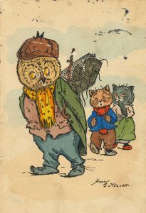 Neilson) représentant un hibou en redingote portant sur son dos une cage remplie de souris, suivi par deux petits chats habillés, avec adresse et timbre ; marque de pli ; en allemand.