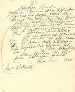 FREUD Sigmund (1856-1939). — MANUSCRIT autographe, Wien [septembre] 1930 ; 1 page in-4 ; en allemand. — Brouillon du faire-part pour le décès de sa mère Amalia Freud.