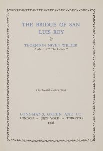Cette 13e édition, issue l’année suivant l’originale. Ce roman historique, qui reçu le prix Pulitzer du roman en 1928, se déroule dans le Pérou du XVIIIe siècle, après la mort de plusieurs personnes dans la chute d’un pont. Cette intrigue explore les problèmes de la Providence, du mal et de la mort.