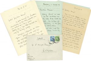 — 15 décembre 1939. Il la remercie pour un envoi de lait, mais est suffisamment approvisionné en graisses par l’attribution. Il aimerait avoir du thé, non pas comme un luxe mais comme une aide à l’augmentation du travail (« nicht als Luxus sondern als Hilfe bei der vermehrten Arbeit ») ; il évoque le surcroît de travail pour son enseignement à l’université ; avec des heures de travail plus longues, d’autant qu’il ne fume pas, un stimulant est important (« Und dabei ist bei längerer Arbeitszeit, zumal ich nicht rauche, ein Anregungsmittel schon wichtig »). Il évoque la visite de son collège hollandais Hendrik Josephus POS, à qui il a essayé de faire comprendre la situation en Europe ; les Néerlandais, avec leurs idées viciées et démocratiques, sont en retard pour tout ; leurs yeux vont enfin s’ouvrir, comme pour les Anglais ; quel que soit le cours et le résultat de cette guerre, ils se retrouveront soudain dans un nouveau monde qu’ils ne pourront pas éviter (« Diesen Leuten werden ja die Augen noch aufgehen; genau so wie den Engländern, die, ganz unabhängig vom einzelnen Verlauf u. Ausgang dieses Krieges, sich plötzlich in einer neuen Welt vorfinden werden, der sie sich nicht entziehen können »). Il parle de son plus jeune fils Hermann, junker de drapeau dans un régiment d’infanterie ; Jörg, qui étudie le génie mécanique, passe actuellement ses examens. Les lettres des étudiants du front sont très gratifiantes et montrent un sens de la responsabilité historique différent des effusions pitoyables des humanistes hollandais, qui ne savent pas où se trouve la réalité (« Die jungen Menschen sind geistig so wach, daß ich staune, weil sie oft in den Übungen so schläfrig erscheinen. Die Briefe der Schüler von der Front sind sehr erfreulich u. zeigen ein anderes geschichtliches Verantwortungsbewußtsein als die kläglichen Ergüsse der holländischen Humanisten, die nicht ahnen, wo die Wirklichkeit ist »)…