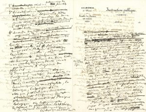 Cette réforme a été imposée par le ministère Fortoul pour assurer l’égalité des filières scientifiques et littéraires. Ce brouillon présente de nombreuses ratures et corrections — « Dans la tendance à peu près unanime du Conseil à blâmer le nouveau plan d’études ou tout au moins à désirer des modifications importantes, je demande à présenter quelques observations et à soumettre quelques réserves. […] J’ai peine à croire que ses législateurs, agissant au début d’un règne nouveau, dans les circonstances que tout le monde sait, au milieu d’un siècle que les découvertes scientifiques ont transformé et marqueront dans la suite des âges d’un signe ineffaçable, j’ai peine à croire dis-je que les législateurs du nouveau plan d’études sous l’inspiration d’un grand politique, n’aient en vue que la science plus ou moins avancée de l’élève qui quitte les bancs du collège et sa force relative dans un examen. Ils songeaient sans doute plus à l’homme qu’à l’enfant, à la société qu’au collège, au siècle et à ses tendances qu’à l’examen »… Et cependant on a placé la méthode au-dessus l’homme, et la valeur du personnel enseignant a faibli depuis l’application du plan d’études… — Pasteur énumère les causes de cette faiblesse :