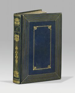 LA PEAU DE CHAGRIN. Études sociales. Paris, Delloye, Lecou, 1838. Grand in-8, veau bleu, encadrement de huit filets dorés et cadre central formé d'un double filet avec petit fer aux angles, dos lisse orné en long, double filet intérieur avec fer aux angles, doublure et gardes de soie gaufrée à décor végétal et argentée, étui moderne (Lacoste).