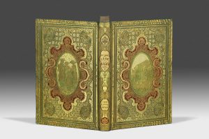 L’ÉTÉ A BADE. Paris, Furne et Cie, Bourdin, [1847]. Grand in-8, veau cerise, plats entièrement couverts d'une plaque dorée avec rehauts en vert, composition ovale différente sur chaque plat, dos lisse orné de même, tranches dorées, couverture (Reliure de l'éditeur).