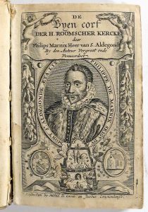 191). Eigentijdse Hollandse perkamenten spitselband : gladde rug met titel in pen (vervuild, gebruinde sneden). Heruitgave (1.uitg. : 1569) van deze scherpe allegorische satire tegen de rooms-kathoiieke kerk door Marnix van St. Aldegonde (Brussel 1540-1598 Leiden). Deze politieke figuur, o.m. burgemeester van Antwerpen in 1584, was voorbestemd voor een kerkelijk ambt maar bekeerde zich tot het Calvinisme tijdens zijn studie aan de universiteit van Genève. Op de vlucht voor Alva werd hij in Nederland een nauwe medewerker van Willem van Oranje en schreef er zijn beroemde "Bijenkorf' in 1568. Gegraveerde titel met medaillonvormig portret van de auteur (kijkend naar links) op de leeftijd van 59 jaar, zijn wapenschild, een bijenkorf en een geïllustreerd citaat uit Apocalyps 3, 20. # Biogr. nat. XI11-800/844; # NNBW I-1307/1312; # Frederiks en Van den Branden 494-495. Réédition de cette satire dirigée contre l’église romaine par Philippe de Marnix, bourgmestre d’Anvers lors de la prise de la ville par les Espagnols en 1585 et conseiller de Guillaume d’Orange, s’ouvrant sur un beau titre gravé avec son portrait en médaillon (pet. défauts). Plein vélin de l’ép. (lég. défraïchi).