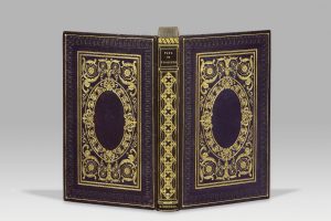 Grand in-8, maroquin violet à long grain, bordure formée d'un filet doré et d'une roulette à froid, plaque dorée à motifs de rinceaux avec médaillon ovale en réserve, dos orné en long d'un décor à répétition, roulette intérieure, gardes de papier blanc moiré, tranches dorées, étui moderne (Thouvenin).
