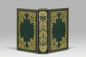 Grand in-8, chagrin vert, deux filets gras et maigre dorés, sur les plats deux grandes plaques réunies entre elles formant encadrement, dos lisse orné en long d'une plaque, quatre filets intérieurs, doublure et gardes de papier moiré ivoire, tranches dorées (Simier R. du Roi).