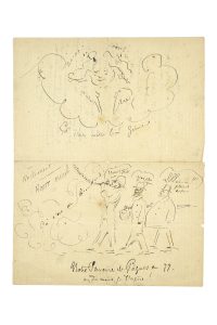 Lettre ornée de DEUX AMUSANTS DESSINS A LA PLUME en pleine page, chacun portant une légende autographe.