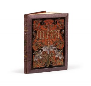 L'EFFORT. LA MADONE. L'ANTECHRIST. L'IMMORTALITE. LA FIN DU MONDE. Paris, Les Bibliophiles Contemporains, 1894. In-4, maroquin parme à encadrement, plats ornés de deux cuirs incisés, le premier portant le titre est décoré de feuillages et passiflores rehaussés de couleurs vert olive, argent, blanc et noir; le second décoré de ronces encadrant la Mort assise sur un globe terrestre entouré de nuées rehaussé des mêmes couleurs, dos à nerfs orné de filets à froid et d'un motif de maroquin mosaïqué, doublures de maroquin mosaïqué de motifs floraux dans les tons jaune, havane, clair et foncé, vert bronze et vert d'eau représentant un large motif d'anémones et de feuillages, gardes de soie irisée dans les tons vert et brun, tranches dorées sur témoins, couverture et dos, chemise, étui (Ch. Meunier, 1908).