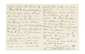 J'étais à Paris hier, et par un hasard une personne est venue me voir, et a aussi vu les tableaux que vous m'avez confié [sic]. Cette personne après examen a fait une offre pour les biens de deux mille cinq cents francs. Je crois que ce n'est pas trop mal vu les piqûres sur le dessin de Degas [...] veuillez je vous prie répondre de suite car la personne pourra partir. Elle aurait bien acheté cela pour ses amis, mais ce sont des notes, et eux ont tous les chefs-d'œuvre de Manet, entre autres le tableau qu'il a fait de Mme Pontillon et Monsieur Morisot avec un enfant dans une voiture, et dont la pochade est la première note, sans les autres personnages du fond [...] En post-scriptum, elle parle d'une femme qui a de bonnes dispositions mais je ne suis pas capable de remplacer M. Pissarro hélas.
