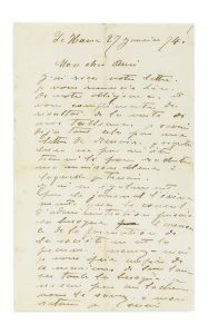LETTRE AUTOGRAPHE SIGNÉE A CAMILLE PISSARRO, datée Le Havre 27 janvier [18]74, 2 pages in-12 (208 x 130 mm), sous chemise demi-maroquin bleu moderne.