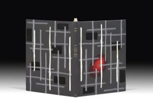lattes rustiques déchiquetées serties à froid, de box gris bleuté et gris perle formant comme une fragile et irrégulière grille à travers laquelle de noirs rectangles parsemés apparaissent mosaïqués de maroquin déchiré non sertis, le premier plat mosaïqué d'un grand astre rougeoyant de maroquin également non serti, dos lisse orné de la date, du titre et du nom de l'auteur en capitales dorées, doublure et gardes de daim écarlate encadrées d'un listel de box gris bleuté, tranches dorées sur témoins, couverture et dos, chemise et étui (Paul Bonet, 1967).