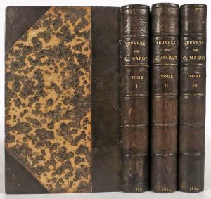 1824. 3 vol. in-8°; frontispice protégé par une serpente (texte n.c., très pet. rouss., qqs pet. taches, très pâles mouill. à la fin du vol. Iii). Rel. de l’époque : demi-maroquin brun à coins, plats de papier marbré, dos à nerfs, (lég. us., dos part. et lég. passés, légères ombres blanches, ex-libris part. collés aux gardes sup.). Excellente édition ornée en frontispice d’un portrait de Marot (1496-1544) gravé par Hopwood, présentée et annotée par Paul Lacroix. Le troisième tome renferme les traductions (Virgile, Ovide, psaumes de David, Pétrarque...) et des oraisons et poèmes attribués à Marot. Le texte suivi est celui de l’édition de 1554, l’orthographe est celle de l’édition de 1545 et les notes sont extraites en grande partie du commentaire de Lenglet du Fresnoy (1674-1755). # Vicaire V-539; # Brunet III-1458/1459. Provenance : baron Maximilian von Goldschmidt-Rothschild (1843-1940), banquier et collectionneur d’art (exlibris armorié); bibliothèque communale de Francfort (tampon); "Restitué par la ville de Francfort suivant acte du 26 janvier 1952" (id.).