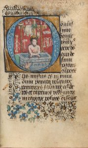Le texte des Heures débute par la lettrine " O " enluminée d'un Christ de douleur, assis dans le sépulcre entouré des instruments de la Passion. Ce décor s'inscrit dans un carré aux écoinçons dorés, cerné d'un liseré noir et prolongé, dans les marges supérieure, interne et inférieure par un décor de rinceaux au trait noir rehaussé d'or, ponctué de fleurs bleues dans l'angle gauche.