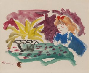 EMILIO GRAU SALA (1911-1975) — Jeune fille rousse accoudée à une table — Aquarelle sur papier. — Signée en bas à gauche. — 18 x 21,5 cm.