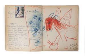Beau dessin aux crayons bleu et rouge signé de Marc Chagall et daté de 1957 sur une double-page, représentant un âne ailé peignant un tableau, et dessin au stylo bille et crayon dédicacé et signé de Roger Chapelain-Midy: