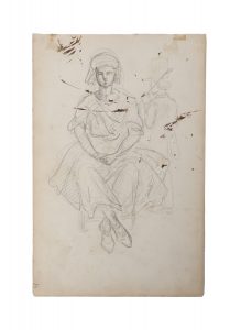 Au verso, dessin original au crayon représentant une femme assise devant un homme en chapeau haut-de-forme.