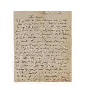 CHIRICO GIORGIO DE (1888-1978) — Lettre autographe signée adressée à Marcel ABRAHAM — Paris, « ce mardi », 2 pages in-12 à l'encre sur papier. — (Pliures centrales, fentes et petit manque).