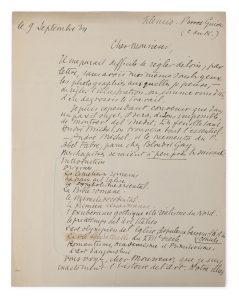 Lettre autographe signée à Christian Melchior-Bonnet (1904-1995), relative à la publication de L'Histoire de l'art religieux à paraître chez Flammarion.