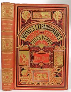 frais). Cartonne polychrome d'édition par Engel d'après une maquette de C. Blancheland : plat à la "mappemonde", dos type "F", 2d plat type "q", tr. dorées (dos lég. passé, lég. sali au plat inf., mention d'app. à la garde sup.). Exemplaire tardif du onzième tirage sans les marques de l'imprimeur aux versos du faux titre général et du titre des "Aventures". Illustré d'in texto et de 6 planches en couleurs (3 par G. Roux dans les "Aventures"). Sans catalogue. # Bottin 403404; # Jahuzac 191. Joint : La maison à vapeur. Voyage à travers l'Inde septentrionale. Dessins par Benett. Bibliothèque d'éducation et de récréation, J. Hetzel et Cie, [c. 1880]. Cartonnage d'édition par A. Lenègre d'après une maquette de A. Souze : pleine percaline rouge à décors or et noir, plat aux "deux éléphants avec titre dans éventail", dos type "D", 2d plat type "f", tr. dorées (pet. rouss., lég. bruni, serpente part. déchirée, pet. taches au plat inf., dos lég. passé). Vol. double, premier tirage. Catalogue AI. # Bottin 277-278; # Jahuzac 225-226.