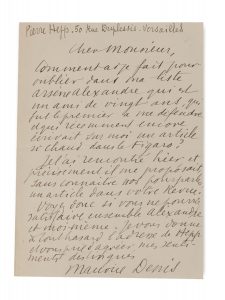 Lettre autographe signée adressée à un journaliste ou à un directeur de revue non identifié auquel Maurice Denis demande si son ami, le critique Arsène Alexandre, peut rédiger l'article qu'on propose de publier sur sa peinture.