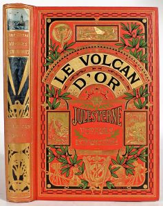 Verne, Jules.- Le volcan d'or. Nombreuses photographies. Douze grandes planches en chromotypographies. Paris, Hetzel, [1906]. In-8°; frontispice et illustrations (très lég. bruni). Cartonnage polychrome d'édition par Engel : plat "à un...