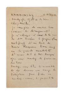 KANDINSKY VASSILY (1866-1944) — Lettre autographe signée adressée à un inconnu. — Neuilly-sur-Seine, 10 décembre 1943, en français, 2 pages in-12 à l'encre.