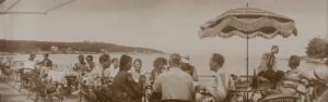 nombreux personnages attablés en terrasse en bord de mer à Juan-les-Pins.