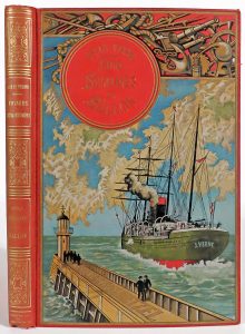 Verne, Jules.- 2 ouvrages en cartonnages d'après une maquette de P. Souze : 1 "à ancre" et 1 "au steamer titre fond rouge". Paris, Hetzel. Gr. in-8°; illustrations (lég. défraìchis, lég. brunis). (1.) L'ïle mystérieuse. Illustrée de 154...
