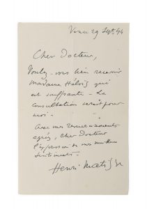 MATISSE HENRI (1869-1954) — Lettre autographe signée adressée à un médecin — Vence, 29 septembre 1944, 1 page in-8 à l’encre sur papier.
