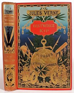 l’Afrique australe. Illustrées de 53 vignettes par Ferat. Gravées par Pannemaker. Bibliothèque d’éducation et de récréation, J. Hetzel et Cie, [c. 1897]. Cartonnage polychrome d’édition par Magnier et ses fils d’après une maquette de A. Souze : plat "au steamer titre fond rouge", dos type "2", 2d plat type simple "C" (déch. à la 1re p.). Vol. simple, septième tirage avec une différence au frontispice : "Les voyages extraordinaires" au lieu de "Les voyages extraordinaires.". Catalogue AJ; # Bottin 443; # Jahuzac 84.— (2). Les frères Kip. Illustrations par George Roux. 12 grandes chromotypographies. Nombreuses vues photographiques. Deux cartes. [1902]. Cartonnage polychrome d’édition par Engel d’après C. Blancheland : plat à la "mappemonde", dos type "F", 2d plat type "p", tr. dorées (1 h.-t. part dérelié, déch. p. 349, cassure à la fin d’un cahier). Vol. double, premier tirage illustré de 12 h.-t. Sans catalogue. # Bottin 239-242 (2d plat type "q"); # Jahuzac 294-296 ("Bottin signale; pour cette première édition, un second plat de type Engel "i" ("q" dans sa propre nomenclature); il ne peut s’agir que d’une erreur, à moins qu’il n’ait eu sous les yeux une hypothétique réédition du type 4").— (3). Bourses de voyage. Quarante-sept illustrations par L. Benett. 12 grandes chromotypographies. Nombreuses vues photographiques. Une carte. [1903]. Cartonnage polychrome d’édition par Engel d’après C. Blacheland : plat à la "mappemonde", dos type "F", 2d plat type "q", tr. dorées (1 h.-t. presque entièrement dérelié). Vol. double, premier tirage illustré de 12 h.-t. Sans catalogue. # Bottin 154-155; # Jahuzac 300.