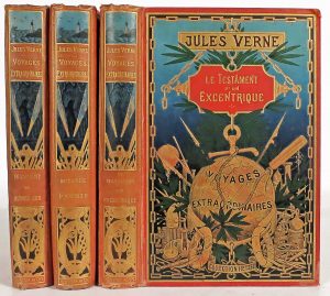 dorées (dos très lég. passés, coiffes frottées, mentions d’app. mss aux gardes sup.). (1). Un capitaine de quinze ans. Dessins par H. Meyer. Gravures par Ch. Barbant. [1898] (qqs pp. déreliées). Vol. double, cinquième tirage illustré de 6 h.-t. Sans catalogue. # Bottin 158 (mentionne un cat.); # Jahuzac 221. Lenoir-Bayard. Amiens (étiq.).— (2). Le testament d’un excentrique. 61 illustrations par George Roux. 35 vues des États-Unis d’Amérique. Carte des États-Unis d’Amérique. [1899] (qqs pp. part. déreliées, pp. 471- 473 totalement déreliées, plusieurs pl. déplacées). Vol. double, premier tirage illustré de 20 h.-t. et de 2 cartes dépl. Catalogue AV. # Bottin 355-356; # Jahuzac 286-287.— (3). Seconde patrie. Soixante-huit illustrations par George Roux. Deux cartes. Deux grandes chromotypographies. [1900]. Vol. double, premier tirage illustré de 12 h.-t. et 2 cartes. Catalogue BH (bruni). # Bottin 341-343; # Jahuzac 291-292.