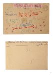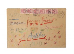 PICASSO Pablo (1881-1973) — Enveloppe calligraphiée à l'adresse de Jacques PRÉVERT — [Cannes, 2 août 1955], crayons de couleur.