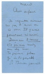 Convocation chez Breton. «On regrette vivement de ne pas t'avoir vu ce soir. Il y avait pourtant nécessité. Demain 3 heures très précises, rendezvous chez moi. Ta présence plus qu'indispensable. Si Thirion pouvait venir, ce serait parfait [...]». [André Thirion (1907/2001), écrivain, membre du groupe des surréalistes; en 1930, il rédigea avec Breton les statuts de l'Association des Artistes et Écrivains Révolutionnaires]