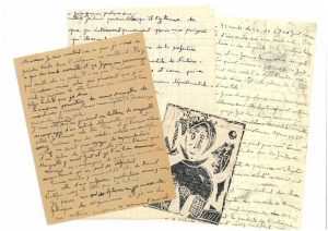 Belle correspondance relative à son oeuvre et son art. «Ma gouache à 32 ronds du 22.11.48 me fait penser que Dubuffet m'avait parlé d'airs arabes sur une seule note. Elle a quelque chose des colliers et des chapelets. Voilà quelque temps j'en étais aux crucifixions et ma femme trouve mon décapité crucifié fort tragique. Ce qui est curieux c'est que j'ai fait ce décapité sans le vouloir. C'est deux cercles l'un dans l'autre que j'ai fait sans motif qui le rende ainsi. Et à la place de la tête il y a comme l'image d'une tête». Il pense faire une exposition dans quelques mois: «rétrospective de mes tableaux sans attaches terrestres et certains seront peut-être assez étonnés que je fais des choses comme ça depuis 1938. J'ai d'ailleurs exposé au salon des réalités nouvelles. Albert Gleizes qui connait mon existence depuis 1938 m'y avait fait inviter. Sur feuille de papier de verre je n'ai peint que mon «Croisé» ça use beaucoup les pinceaux de peindre sur des feuilles de papier de verre». Un journaliste de province l'avait alors baptisé «Le Picasso en sabots». «A mon exposition à l'arcen- ciel j'avais surtout des choses exécutées en tenant compte des conseils de Monsieur André Lhote et j'avais dû très mal comprendre ses explications. J'aime surtout les produits de l'artisanat, les oeuvres d'artistes me laissent assez indifférent même les chefs d'oeuvre». Puis il parle longuement de Maurice Charrieau, un jeune paysan.