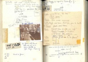 Texte tapuscrit surchargé de notes et croquis, accompagné d'un plan de tournage manuscrit dépliant sur plusieurs pages, et de 57 photos originales prises durant le tournage, collées en regard du scénario.