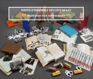 Convoi pour Dien-Bien-Phu (1966, très nombreuses photos). Les Lâches vivent d'espoir de Claude BERNARD-AUBERT (1961, nombreuses grandes photos). Les Moutons de Praxos [À l'aube du troisième jour] de Claude BERNARD-AUBERT (1963, nombreuses grandes photos). À Fleur de peau de Claude BERNARD-AUBERT (1963, sans photos mais nombreuses notes manuscrites). Le Huitième jour de Marcel HANOUN (1960, avec Emmanuelle Riva, nombreux fragments de pellicules insérés dans le texte). Les Tripes au soleil de Claude BERNARD-AUBERT (1959, nombreuses notes au crayon, accompagné de photographies et d'une série d'estampes de Raymond GID (la dernière signée et numérotée 51/59), illustrant Tripes au soleil). Les Violents d'Henri CALEF (1957, avec Paul Meurisse et Françoise Fabien, nombreuses notes mais pas de photos). Les Cracks d'Alex JOFFÉ (1968, avec Bourvil et Robert