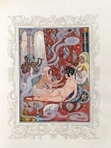 traversé d'une tige dorée et fleurettes mos. en cuir noir, tête dorée, couv. et dos cons. (égratignures à deux nerfs et au plat inf., coupes usées). Illustré de 12 aquarelles de la franco-danoise Gerda Wegener (1899-1940), clichées et protégées par une serpente légendée. Texte serti d'un encadrement tiré en gris, tout comme les bandeaux et autres nombreuses vignettes ornant l'ouvrage. Tirage à 650 ex., un des 488 sur vélin teinté grenu (n° 347).