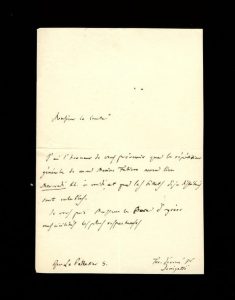 L.A.S., à «Monsieur le Comte». [Paris, 1835]. 1 p. in-8. Encre brune sur feuillet double de papier filigrané «J Whatman». Chemise ancienne calligraphiée conservée.