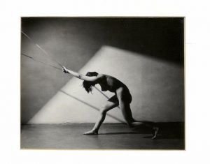 Très beau cliché représentant une femme nue, sujet de prédilection du photographe, tirant une corde, sur fond de motif géométrique créé par une lumière provenant de la gauche